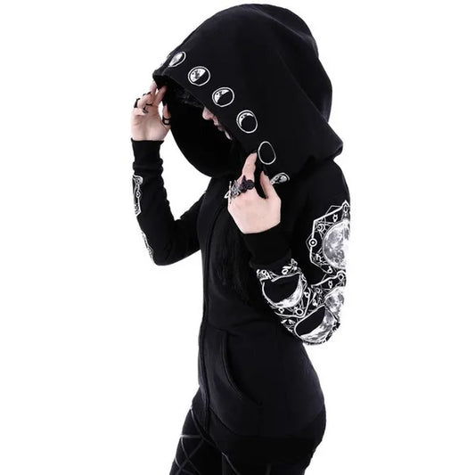 Gothic Occult Moon Phases Graphic Print Woman's Long Sleeve Fitted Hoodie w/Oversized Hood