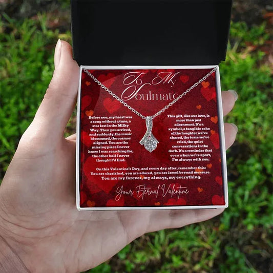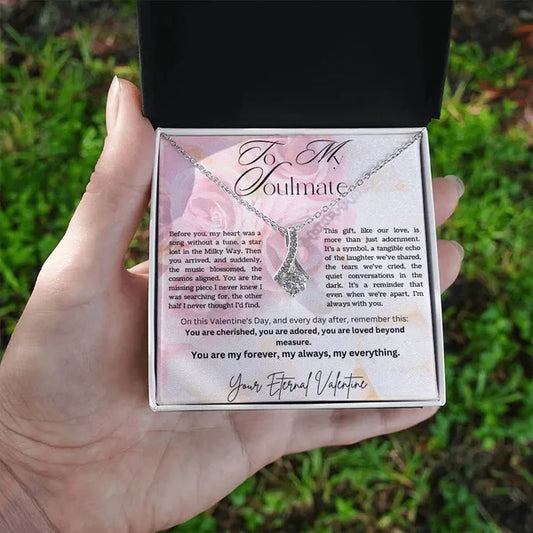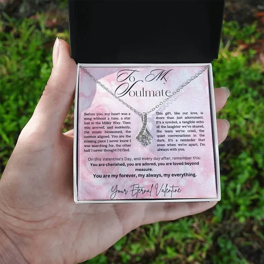 Para mi alma gemela, collar de lágrima de belleza seductora para el día de San Valentín en oro blanco de 14 quilates y acabados en oro amarillo de 18 quilates. Estilo 1.